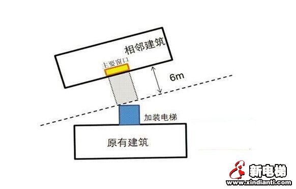 增設電梯方案的梯井(或連廊)與本交通單元內(nèi)住宅或相鄰住宅主要使用房間(臥室或起居室)窗戶的正投影凈距小于6米,可視為嚴重遮擋,如下圖所示: