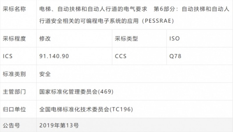 GB/T 35850.2-2019《電梯、自動(dòng)扶梯和自動(dòng)人行道安全相關(guān)的可編程電子系統(tǒng)的應(yīng)用 第2部分:自動(dòng)扶梯和自動(dòng)人行道(PESSRAE)》為修改采納ISO 8102-6:2019標(biāo)準(zhǔn),已經(jīng)于2019年10月18日發(fā)布,2020年5月1日起實(shí)施。