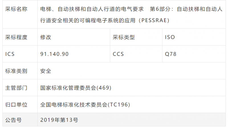 核心提示:GB/T 35850.2-2019《電梯、自動(dòng)扶梯和自動(dòng)人行道安全相關(guān)的可編程電子系統(tǒng)的應(yīng)用 第2部分:自動(dòng)扶梯和自動(dòng)人行道(PESSRAE)》為修改采納ISO 8102-6:2019標(biāo)準(zhǔn),已經(jīng)于2019年10月18日發(fā)布,2020年5月1日起實(shí)施。