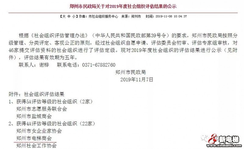 根據(jù)《社會(huì)組織評估管理辦法》(中華人民共和國民政部第39號令)的要求,鄭州市民政局對46家提交評估資料的社會(huì)組織進(jìn)行了評估定級。近日,鄭州市民政局公示2019年度社會(huì)組織評估結(jié)果,鄭州市電梯商會(huì)獲評為4A社會(huì)組織稱號。