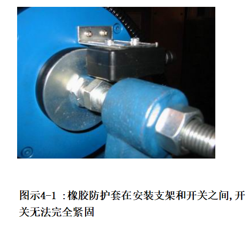 拆下制動(dòng)開關(guān)外面的橡膠保護(hù)套(如果有的話),并將開關(guān)安裝支架上,調(diào)整制動(dòng)開關(guān)固定位置,保證手動(dòng)打開抱閘時(shí)開關(guān)受壓動(dòng)作后仍然有0.5~1.0mm的行程. 調(diào)整順序按圖示4-1, 4-2, 4-3進(jìn)行。