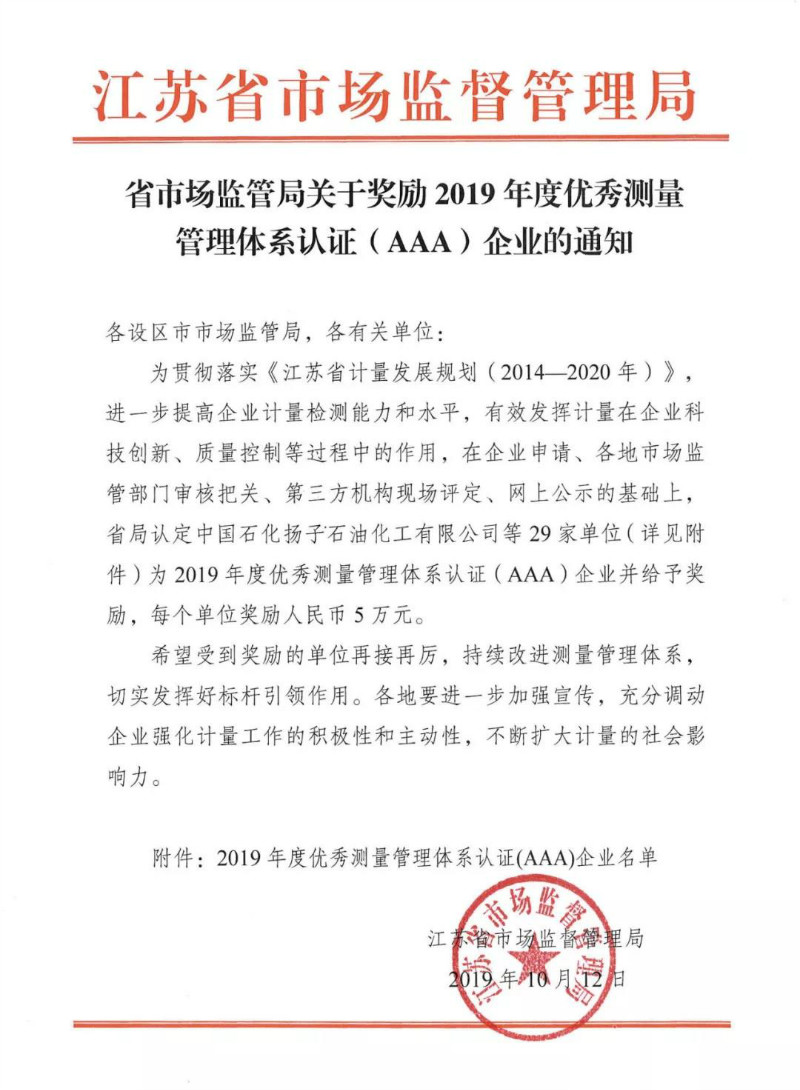 2019年12月3日,接江蘇省市場監(jiān)督管理局正式通知,康力電梯被評定為“江蘇省2019年度優(yōu)秀測量管理體系認證(AAA)企業(yè)”。