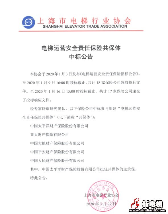 經專家評審研究確認,中國太平洋保險、亞太財產保險、中國平安財產保險、中國大地財產保險、中國人民財產保險中標參與建設“電梯運營安全責任保險共保體”