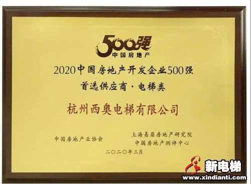 近日,以“重塑 · 遠(yuǎn)見 · 啟程”為主題的2020年中國房地產(chǎn)500強(qiáng)測(cè)評(píng)成果發(fā)布會(huì)暨500強(qiáng)高峰論壇隆重召開。西奧電梯憑借過硬的綜合實(shí)力以及良好的業(yè)界口碑,榮獲“中國房企500強(qiáng)首選供應(yīng)商”榮譽(yù)。