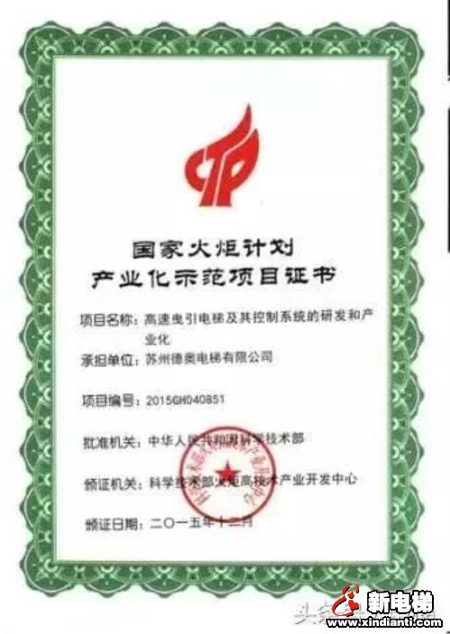 蘇州德奧電梯喜獲國家火炬計(jì)劃項(xiàng)目證書