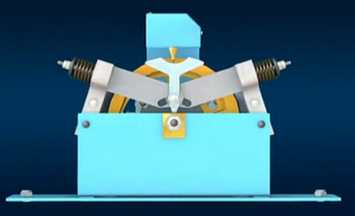 當(dāng)電梯運行速度超過額定速度一定值時,甩塊由于離心作用向外甩出、直至觸發(fā)電氣開關(guān)動作,如下圖所示:
