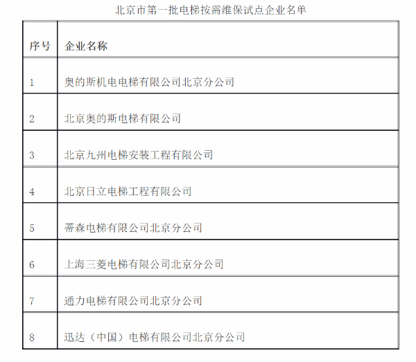 核心提示:近日,北京市市場監(jiān)督管理局公布了北京市第一批電梯按需維保和自行檢測試點(diǎn)企業(yè)名單。電梯按需維保名單包括:1奧的斯機(jī)電電梯有限公司北京分公司,2北京奧的斯電梯有限公司,3北京九州電梯安裝工程有限公司,4北京日立電梯工程有限公司,5蒂森電梯有限公司北京分公司,6上海三菱電梯有限公司北京分公司,7通力電梯有限公司北京分公司,8迅達(dá)(中國)電梯有限公司北京分公司。自行檢測試點(diǎn)企業(yè)包括:上海三菱電梯有限公司北京分公司。
