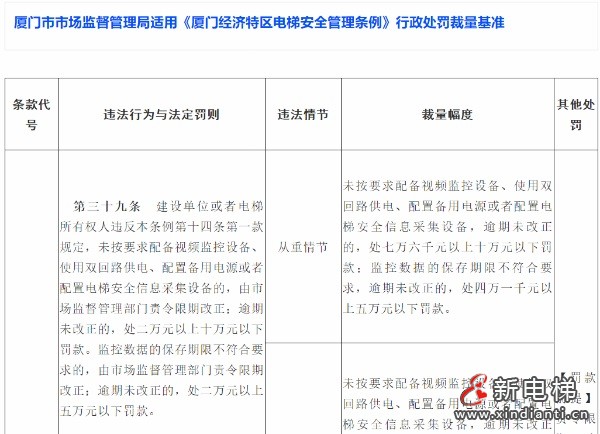 廈門市市場(chǎng)監(jiān)督管理局關(guān)于印發(fā)適用《廈門經(jīng)濟(jì)特區(qū)電梯安全管理?xiàng)l例》行政處罰裁量基準(zhǔn)的通知。通知指出,電梯安裝、改造、修理單位違反規(guī)定的,最高處罰10萬(wàn),電梯維護(hù)保養(yǎng)單位違反相關(guān)條例的,最高處罰24萬(wàn)。