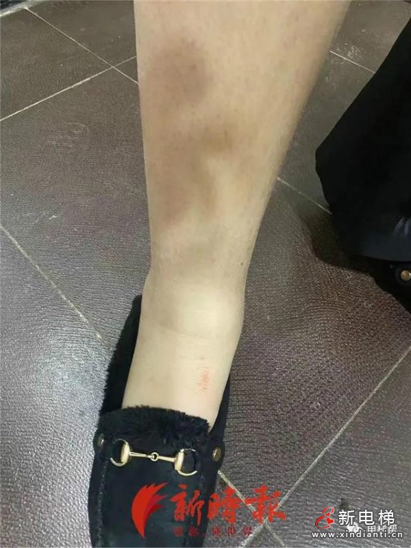 據(jù)當(dāng)時(shí)監(jiān)控畫面顯示,張女士在電梯內(nèi)被困近半個(gè)小時(shí)后,才被相關(guān)工作人員從地下三層救出來(lái)。其間,張女士一度用手艱難地?fù)沃輧?nèi)把手,不時(shí)彎腰向前弓著身體。“我先被送回家后,家人給我打的120電話,被抬到擔(dān)架送上車轉(zhuǎn)到了醫(yī)院。”張女士說(shuō),當(dāng)天其腿部出現(xiàn)腫脹現(xiàn)象,醫(yī)生建議留院觀察,“直到后來(lái)物業(yè)工作人員來(lái)到醫(yī)院看我情況,并且拍了照片。”后來(lái),張女士腿部皮膚又出現(xiàn)發(fā)紫發(fā)紅現(xiàn)象。據(jù)張女士提供一段事發(fā)兩天后物業(yè)工作人員去其家里看望時(shí)的視頻,腿部仍呈現(xiàn)出淤青腫脹狀。