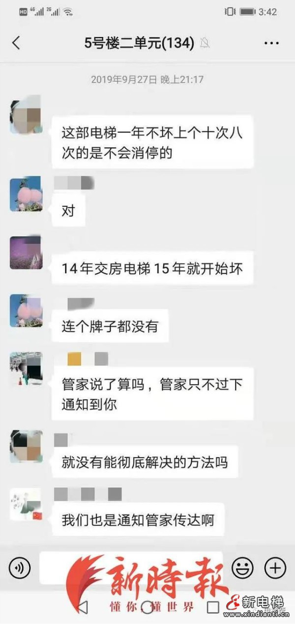 2月21日,新時(shí)報(bào)記者注意到,該單元電梯品牌有“巨人通力”字樣,且位于地下三層的按鍵面板還用膠帶固定。當(dāng)天,該單元樓多名業(yè)主也均向新時(shí)報(bào)記者證實(shí),“電梯大大小小出現(xiàn)過(guò)幾十次問(wèn)題了,還有其他業(yè)主曾被困在電梯里。電梯質(zhì)量也讓大家產(chǎn)生了懷疑。”據(jù)張女士提供小區(qū)業(yè)主群聊天記錄顯示,近一個(gè)多月電梯已出現(xiàn)過(guò)多次問(wèn)題。另外,2019年9月,該單元樓南梯鋼絲繩出現(xiàn)斷股故障,因維修費(fèi)用較高還動(dòng)用了維修基金。