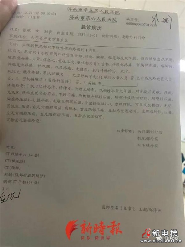 電梯沒(méi)有出現(xiàn)急墜,且相關(guān)保養(yǎng)及年檢也均正常。張女士雙腿的傷情是否與該事故有關(guān)?據(jù)事發(fā)前監(jiān)控畫面顯示,張女士獨(dú)自一人正常走進(jìn)電梯,且走路并無(wú)異樣。然而,她被救出來(lái)后整個(gè)身體幾乎癱軟,被工作人員攙扶出來(lái)。據(jù)張女士向新時(shí)報(bào)記者提供當(dāng)天上午10時(shí)24分章丘區(qū)人民醫(yī)院出具急診病歷顯示,右踝腫脹可見(jiàn)皮膚擦傷,無(wú)明顯流血壓痛,右足背側(cè)及足跟有壓痛,且部分部位麻木;左踝也有腫脹和壓痛。其頭頸胸部、骶尾部、雙下肢外傷。