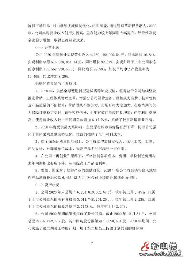 康力電梯:2020年?duì)I業(yè)收入42.8億元,同比增長(zhǎng)16.84%;凈利潤(rùn)4.86億元,同比增長(zhǎng)92.99%。