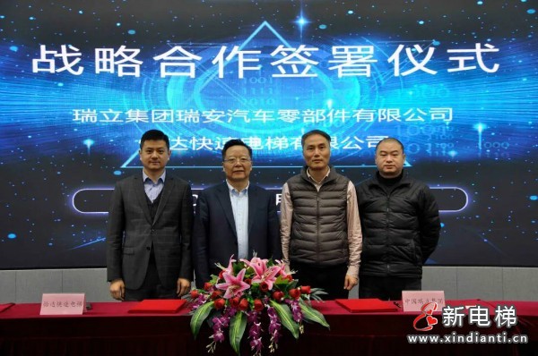 2月27日,怡達(dá)快速電梯有限公司和瑞立集團(tuán)瑞安汽車(chē)零部件有限公司戰(zhàn)略合作簽署儀式在南潯隆重舉行,雙方將在產(chǎn)品采購(gòu)、技術(shù)交流、業(yè)務(wù)服務(wù)等多方面開(kāi)展市場(chǎng)合作,結(jié)成共贏、可持續(xù)發(fā)展的戰(zhàn)略合作伙伴關(guān)系。這是怡達(dá)快速電梯繼與萬(wàn)洋集團(tuán)、上海房德科創(chuàng)實(shí)業(yè)集團(tuán)、鴻坤集團(tuán)等產(chǎn)業(yè)園、房企集團(tuán)之后的又一重要戰(zhàn)略合作,也是2021年新年的首場(chǎng)簽約儀式。