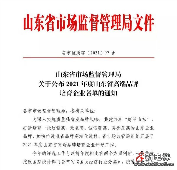 為深入實施質量強省及品牌戰(zhàn)略,共建共享“好品山東”打造培育一批質量高、效益高、誠信度高、美譽度高的山東企業(yè)品牌,加快推進山東省品牌高端化進程,山東省市場監(jiān)管局組織開展了2021年度山東省高端品牌培育企業(yè)評選工作。山東富士制御電梯有限公司榜上有名!
