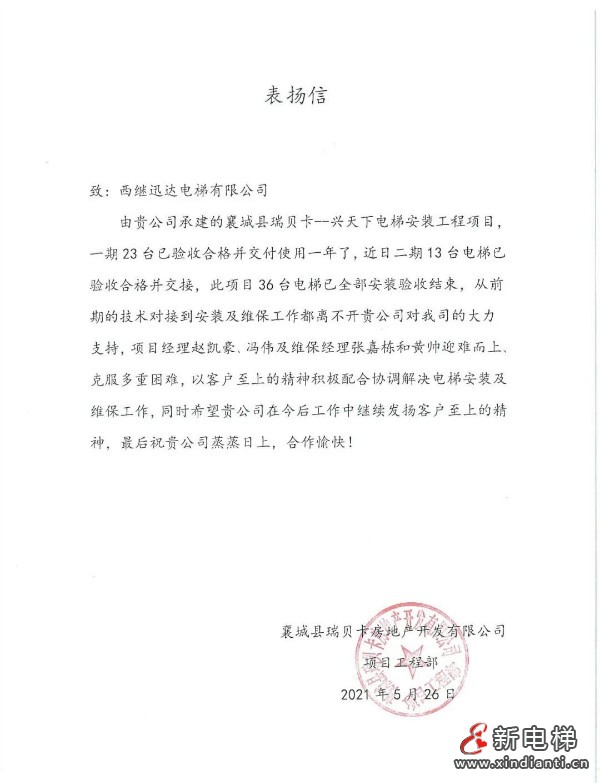 近日,西繼迅達(dá)收到了一封來(lái)自襄城縣瑞貝卡興天下項(xiàng)目的表?yè)P(yáng)信,項(xiàng)目工程部在信中表達(dá)了對(duì)公司項(xiàng)目負(fù)責(zé)人員的充分肯定,并對(duì)項(xiàng)目對(duì)接到安裝維保工作給予了高度贊揚(yáng),希望公司能夠繼續(xù)發(fā)揚(yáng)客戶至上精神,圓滿完成項(xiàng)目后續(xù)工作!