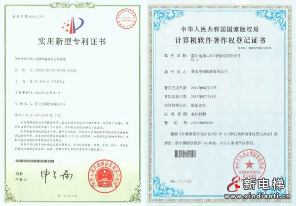 菱王物流園區(qū)電梯配套解決方案的關(guān)鍵技術(shù)“電梯智能物流運(yùn)送系統(tǒng)”和“菱王電梯與AGV智能車聯(lián)控軟件”獲實(shí)用新型專利和軟件著作權(quán)證書。