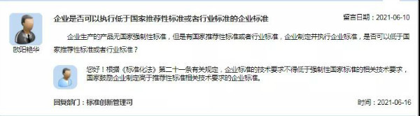 總局回復(fù):企業(yè)可以執(zhí)行低于國(guó)家推薦性標(biāo)準(zhǔn)或行業(yè)標(biāo)準(zhǔn)?