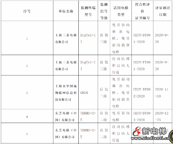 上海市聯(lián)合電梯安全技術(shù)促進(jìn)中心受上海市市場監(jiān)督管理局(原上海市質(zhì)量技術(shù)監(jiān)督局)委托,自2019年起,對電梯配備具有運行參數(shù)采集和網(wǎng)絡(luò)遠(yuǎn)程傳輸功能的監(jiān)測裝置開展了對標(biāo)符合性評價工作。至今,已經(jīng)通過上海市地方標(biāo)準(zhǔn)DB/T 1123-2018《智慧電梯監(jiān)測終端技術(shù)要求》符合性評審的名單公布,包含上海三菱以及東芝電梯等企業(yè)。
