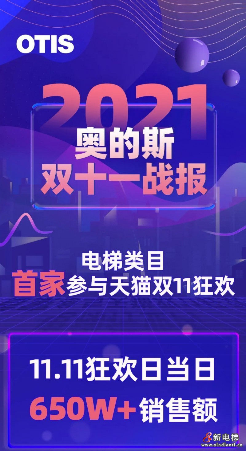 2021奧的斯雙十一戰(zhàn)報,電梯類目首家參與天貓雙十一狂歡,11.11狂歡日當日創(chuàng)650w+銷售額。