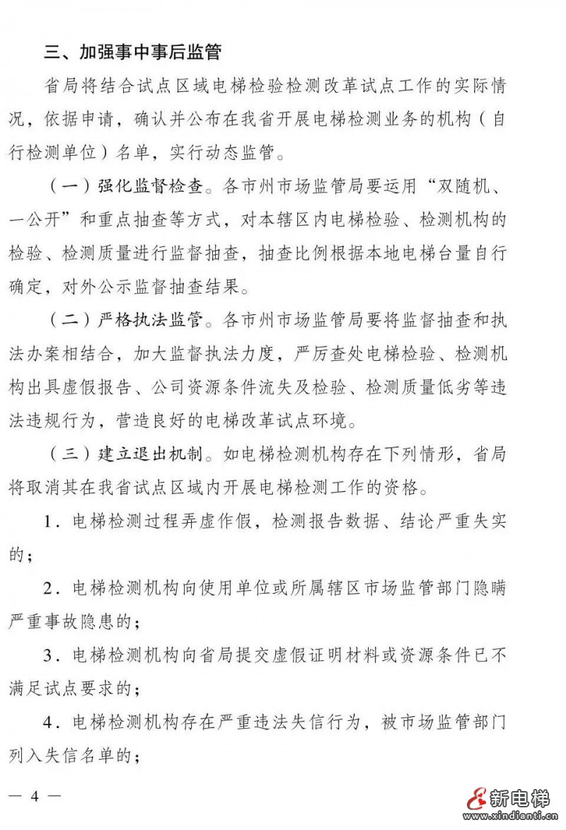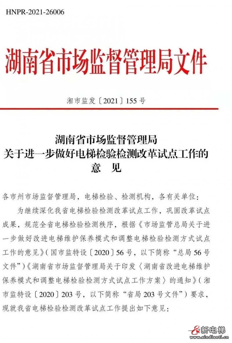 核心提示:湖南省市場監(jiān)督管理局關于進一步做好電梯檢驗檢測改革試點工作的意見