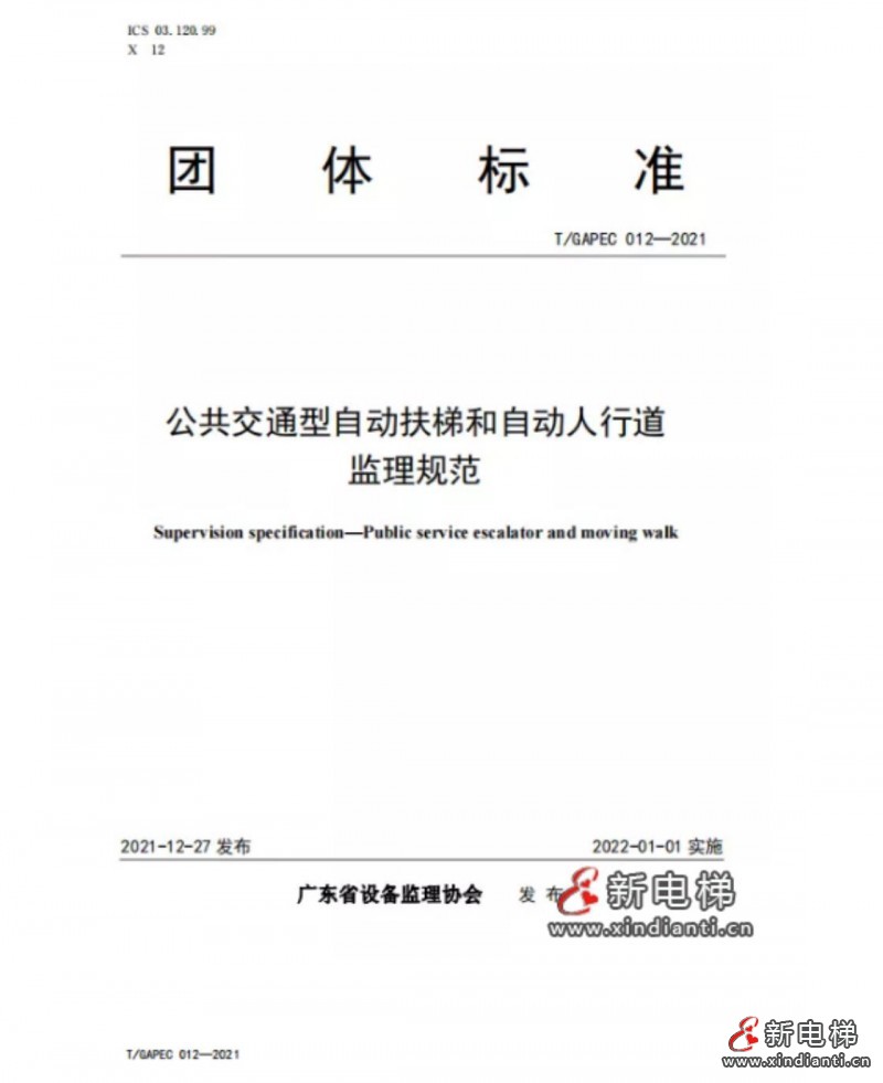 12月27日,廣東省設(shè)備監(jiān)理協(xié)會發(fā)布《公共交通型自動扶梯和自動人行道監(jiān)理規(guī)范》團體標準,自2022年1月1日起實施。