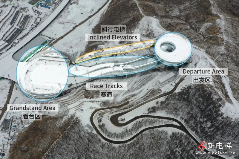 萊茵電梯根據(jù)場館特點為其量身定制的斜行電梯坐落于“雪如意”主體建筑旁邊,幫助跳臺滑雪運動員從地面快速到達賽道起點。電梯整體提升高度107.3米,運行斜長244.206米,單程時長不到兩分鐘。