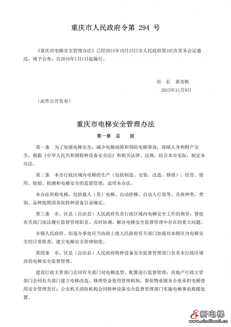 核心提示:《重慶市電梯安全管理法》已經(jīng)2015年10月23日市人民政府第107次常務(wù)會(huì)議通過,現(xiàn)予公布,自2016年1月1日起實(shí)行。