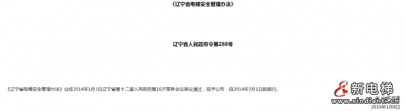 核心提示:《遼寧省電梯安全管理辦法》業(yè)經2014年1月3日遼寧省第十二屆人民政府第16次常務會議審議通過,現(xiàn)予公布,自2014年3月1日起施行。