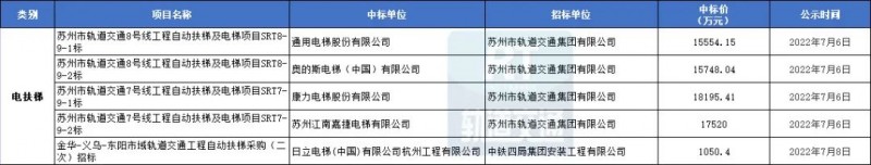 7月城市軌道交通自動(dòng)扶梯采購有5條中標(biāo)信息,總中標(biāo)金額68068萬元。通用電梯股份有限公司獲得蘇州市軌道交通8號線工程自動(dòng)扶梯及電梯項(xiàng)目SRT8-9-1標(biāo)。奧的斯電梯(中國)有限公司獲得蘇州市軌道交通8號線工程自動(dòng)扶梯及電梯項(xiàng)目SRT8-9-2標(biāo)??盗﹄娞莨煞萦邢薰精@得蘇州市軌道交通7號線工程自動(dòng)扶梯及電梯項(xiàng)目SRT7-9-1標(biāo)。蘇州江南嘉捷電梯有限公司獲得蘇州市軌道交通7號線工程自動(dòng)扶梯及電梯項(xiàng)目SRT7-9-2標(biāo)。日立電梯(中國)有限公司杭州工程有限公司獲得金華-義烏-東陽市域軌道交通工程自動(dòng)扶梯采購(二次)招標(biāo)項(xiàng)目。