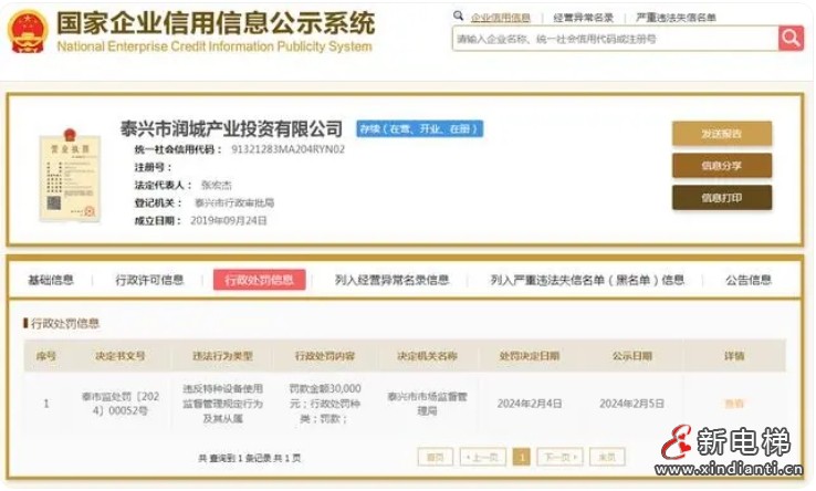使用無檢驗合格材料電梯 泰興市潤城產(chǎn)業(yè)投資有限公司被罰3萬元