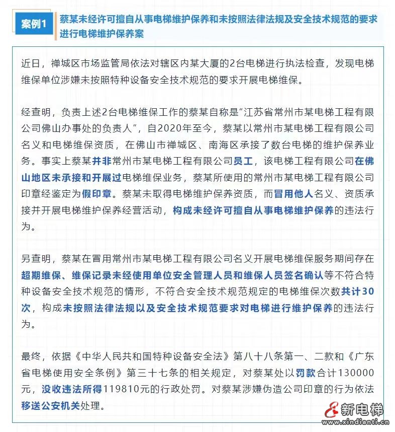 近期,廣東佛山禪城市場(chǎng)監(jiān)管局公布2宗電梯維保典型案例,一起是偽造印章冒用他人名義資質(zhì)開展電梯維保,一起是虛假維保。