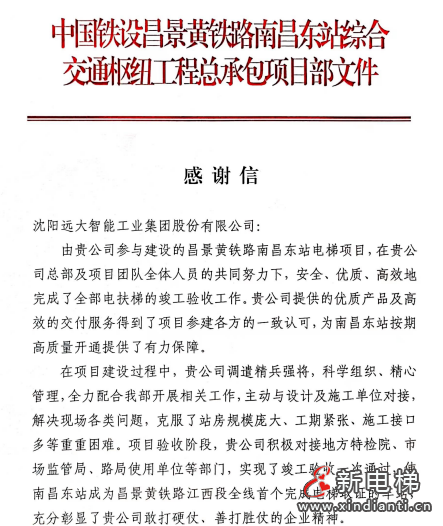 作為南昌東站電梯設(shè)備工程的承接方,博林特電梯為其供應(yīng)了111臺直梯和扶梯,彰顯出強(qiáng)大的制造實(shí)力和卓越的技術(shù)力量。在建設(shè)進(jìn)程中,中國鐵設(shè)南昌東站項(xiàng)目部更是特地發(fā)來表揚(yáng)信,對項(xiàng)目組給予了高度的肯定。