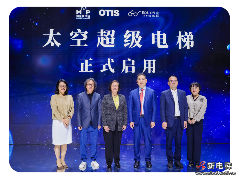 奧的斯全球公司董事會主席朱蒂(左三)、奧的斯中國區(qū)總裁羅小莉(左一)、著名藝術(shù)家、浦東美術(shù)館美育推廣大使徐冰(左二)、陸家嘴集團董事長徐而進(jìn)(右三)、上海市浦東新區(qū)國資委副主任張昇平(右二)、陸家嘴集團副總經(jīng)理、浦東美術(shù)館董事長李旻坤(右一)出席“太空超級電梯”啟用發(fā)布會。
