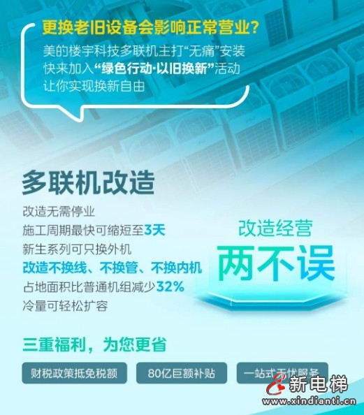 美的樓宇科技“綠色行動·以舊換新”活動持續(xù)進(jìn)行中,支持多聯(lián)機(jī)、水機(jī)、熱泵、電梯、控制五大系列煥新,可享財稅政策抵免稅額、80億巨額補(bǔ)貼和免費(fèi)的一站式無憂售后服務(wù),省錢、高效更安心!