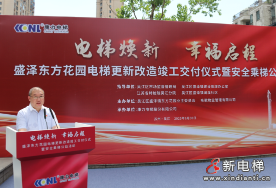 2025年6月30日,吳江區(qū)首批次國債支持老舊住宅電梯更新改造--盛澤東方花園29臺電梯更新改造工程正式交付。吳江區(qū)市場監(jiān)督管理局、吳江區(qū)盛澤鎮(zhèn)建設管理辦公室、江蘇省特檢院吳江分院、吳江區(qū)盛澤鎮(zhèn)瀾溪社區(qū)各級領導,東方花園業(yè)主代表、詠歌物業(yè)相關負責人、康力電梯相關負責人共計50余人,共同見證“電梯煥新·幸福啟程”。