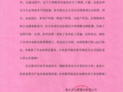 近日,西繼迅達收到一封來自萬新置業(yè)相關領導送來的感謝信,信中“想客戶所想、幫客戶所需、為客戶所急”等語句,承載著對西繼迅達電梯的充分肯定和認可。[詳情]